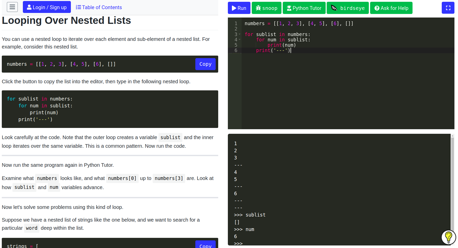 With a single click, users can run powerful debuggers to visualise execution and find problems. There are three debuggers, each with their own strengths: Python Tutor, Snoop, and Bird's Eye (pictured).