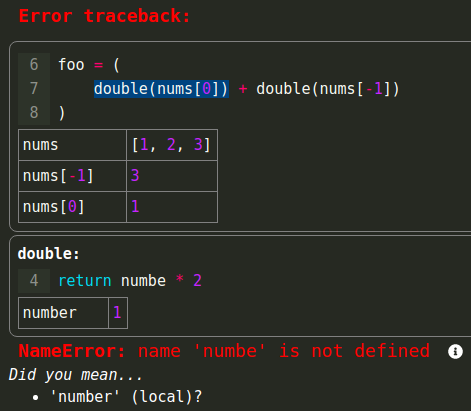 Normal Python tracebacks are intimidating to beginners. futurecoder removes the fear and makes them helpful instead.